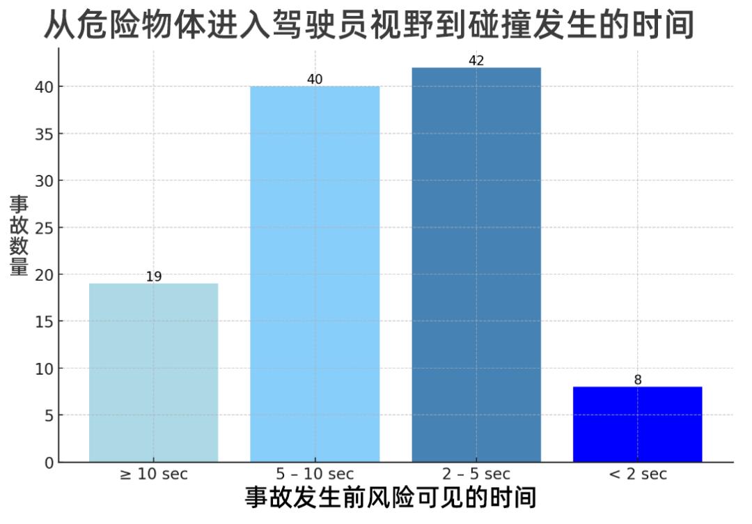 这些碰撞中,超过一半(59起)的碰撞中,危险在撞击前5秒或更长时间即可见,其中19起在碰撞前10秒以上可见危险。