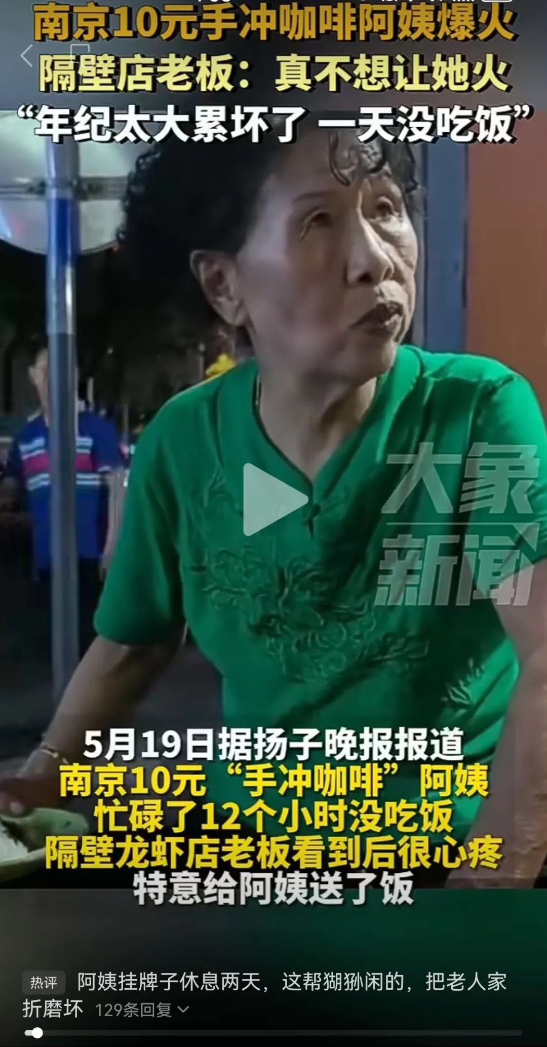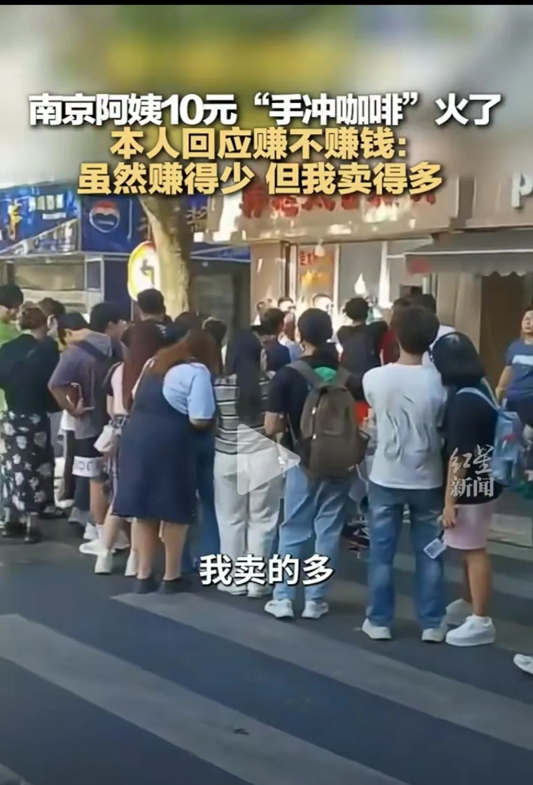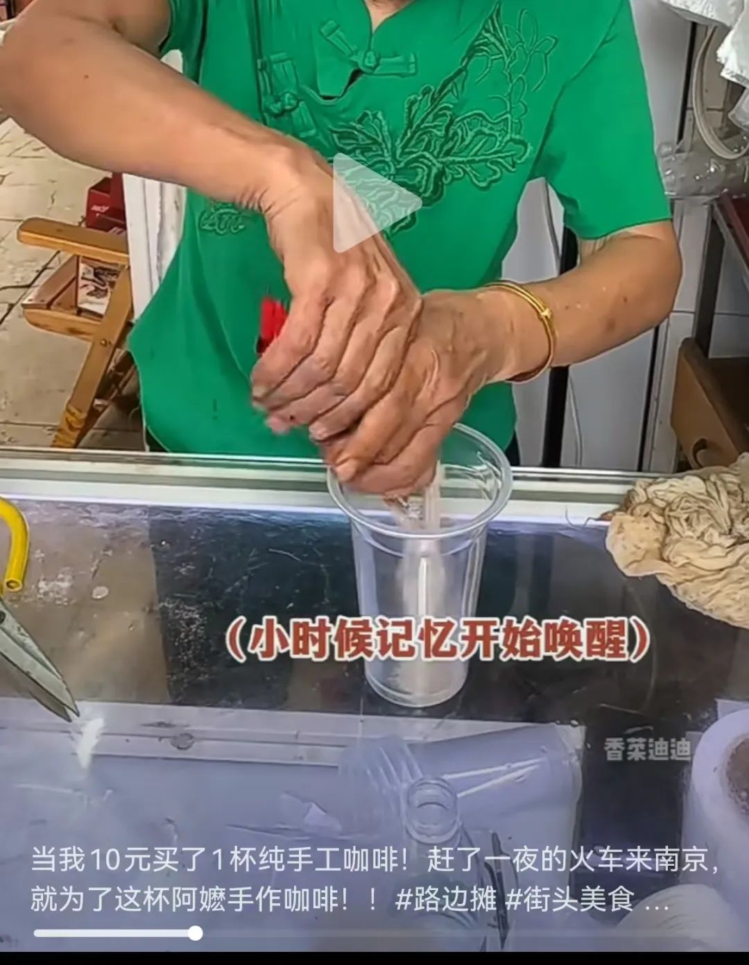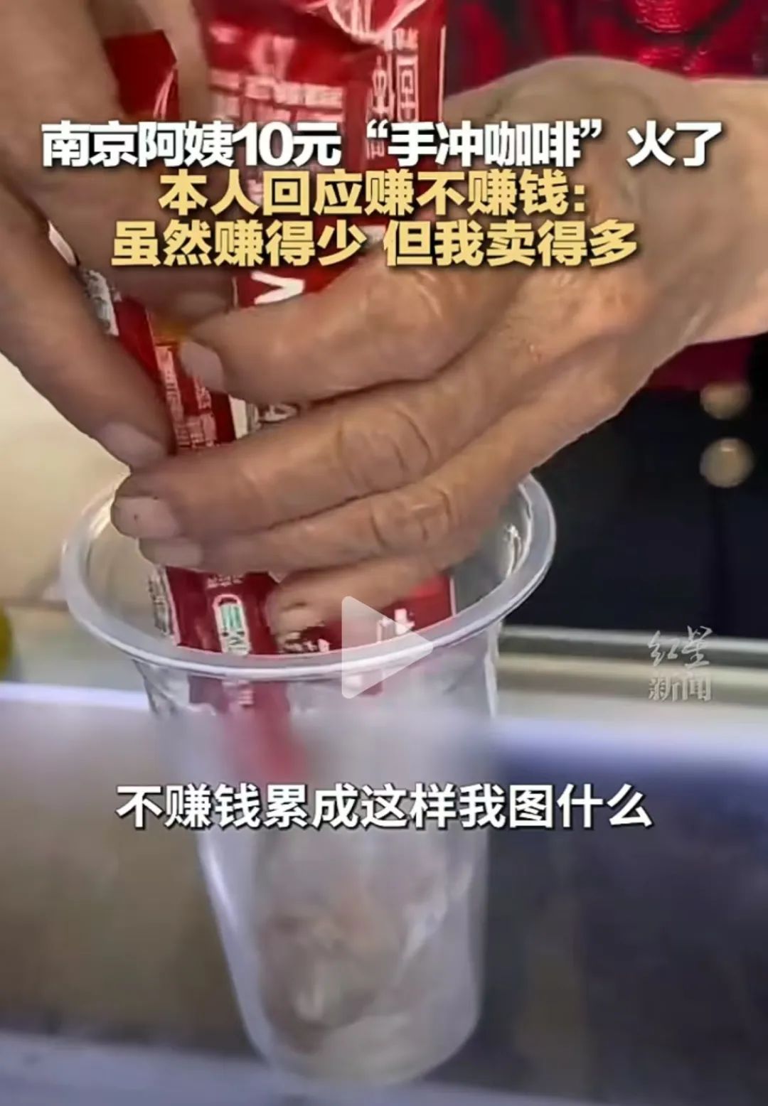 根据网上的报道,这位阿姨在南京街头售卖10元一杯的“手冲雀巢咖啡”而走红网络。她的摊位以亲民的价格和独特的冲泡手法吸引了众多市民和游客的关注。视频里看到,使用的是普通的雀巢速溶咖啡粉,通过当面冲泡的方式,给顾客带来一种朴素而真实的咖啡冲泡体验。
