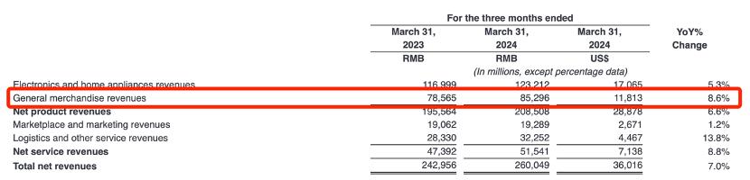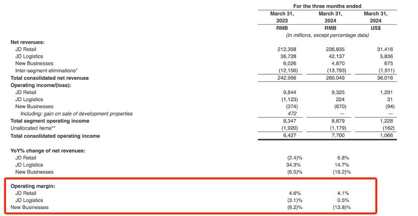 在2024年Q1财报中,有些观点确实得到了验证,如零售业务的平台类收入同比增长仅有1.2%,这主要由于对开放平台商家补贴所致,又如自营业务收入同比增长6.6%,持续低于双位数增长。