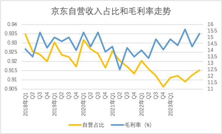 2020年之后,“二选一”落锤,自此横亘在京东开放战略头上的障碍不复存在。也就从此开始,京东自营占比迅速下降,开放平台在稳步推进中,与此同时毛利率亦进入了改善通道。