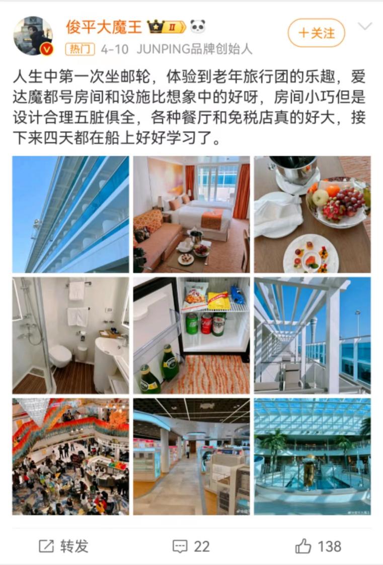 不过纵观整个国内外邮轮公司,对于品牌合作、跨界联名仅仅是小范围试水,对外的招商引资或许是邮轮走向大众市场的重要抓手。另外对于消费者而言,邮轮相关娱乐活动在社交媒体的传播内容相对较少,范围较窄,更多的是官方账号以及为数不多的“自来水”,这就导致了还有很多年轻人对于邮轮丰富的娱乐活动并不了解,各大邮轮公司如若在社交媒体营销上加大投入则可以触达到更多的年轻人。