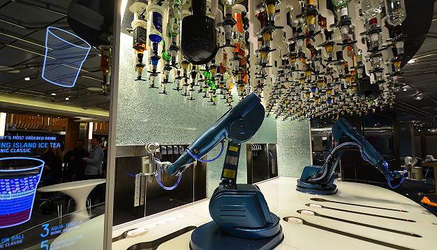 如若想要吸引更多的年轻人,势必要从他们的兴趣点出发。除了年轻人喜欢的游乐园、游戏外,智能Bar、机器人酒吧也在邮轮上随处可见,舱内上万种饮品由麻省理工学院设计的两个机器人调配,这些极具现代化的设施,给人一种穿越到欧美大片里的感觉。