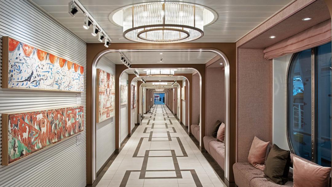 在设计上,东方梦想号布置了欧洲文化特色的壁画、油画,跨越4-6层的船头魅力剧院。船舱内四幅色彩艳丽的壁画,分别表达莎士比亚的《仲夏夜之梦》、以日本天皇为背景映射英国腐败的戏剧、荷马史诗《奥德赛》、吉普赛女郎的《卡门》,从装潢细节中就能感受到跨洋班轮的历史,有一种跨越中西之感。