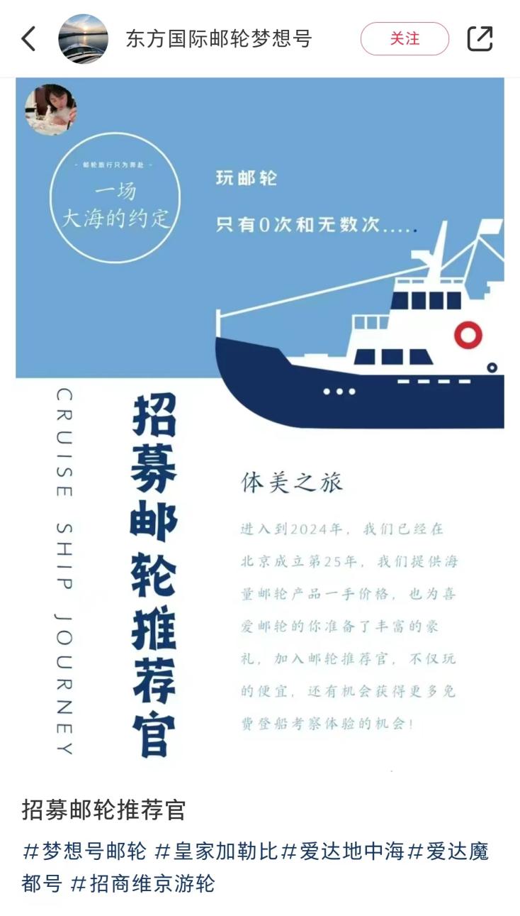 在东方国际邮轮梦想号小红书官方账号上,有一则招募邮轮推荐官的帖子,号召年轻人赴一场大海的约定,希望吸引更多年轻人体验邮轮旅行。