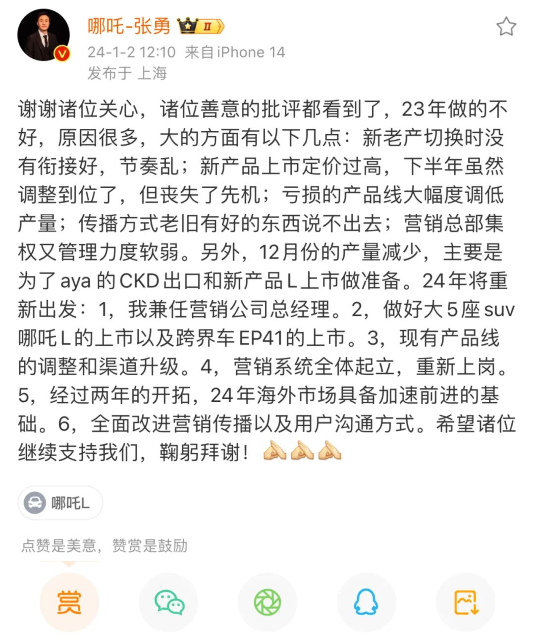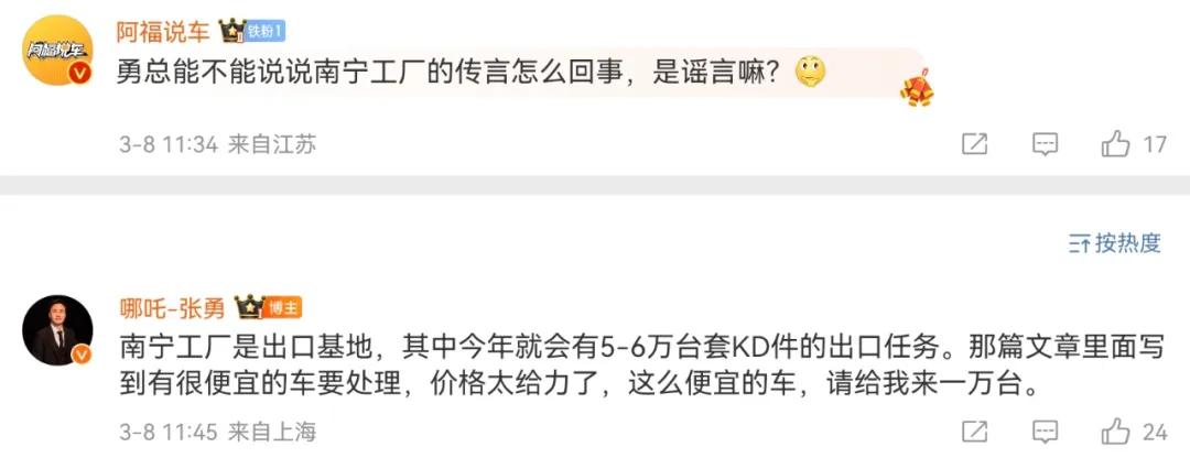 但这一次,哪吒汽车依然没有声明、没有公告、也没有澄清、更没有律师函。只是在3月8日的微博网友提问中,张勇从侧面答复道:“南宁工厂是出口基地,其中今年就会有5-6万台套KD件的出口任务。”
