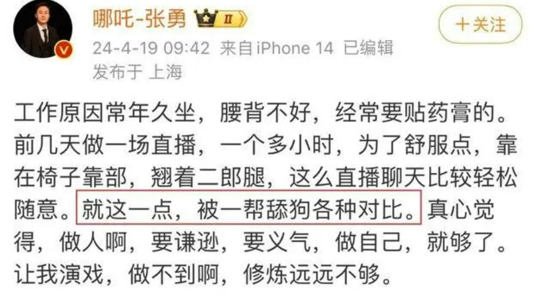 张勇发微博回应,“工作原因常年久坐,腰背不好,为舒服点靠着椅子跷二郎腿,这样直播比较轻松随意,“就这一点,被一帮舔狗各种对比。”