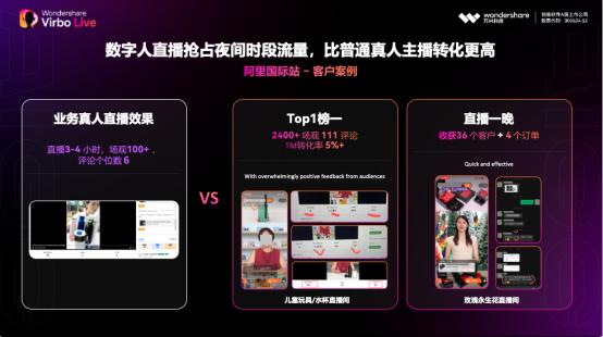 A股上市公司万兴科技旗下数字人营销视频创作工具“万兴播爆”业务负责人Dour介绍,曾有几个阿里国际站客户向其反馈了极为惊人的数据:使用数字人,一个季度可以完成高达1700~2000小时的直播时长,相当于平均每天直播17个小时。“理论上来说,在某些平台,只要你愿意,哪怕是7×24这样的全天候营业也不是不可实现。”