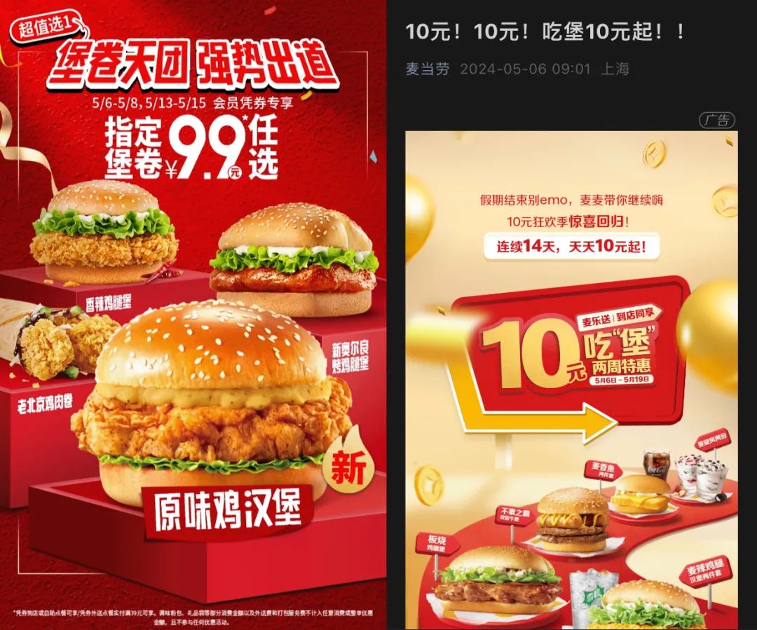 次日,老对家麦当劳宣布上架每日10元2件的超值活动,麦门领券后可下单包含汉堡、小食、甜品以及单品在内的多款套餐,活动时间将持续两周。至此,洋快餐两巨头实现了在十元及以下价格段的“胜利会师”。