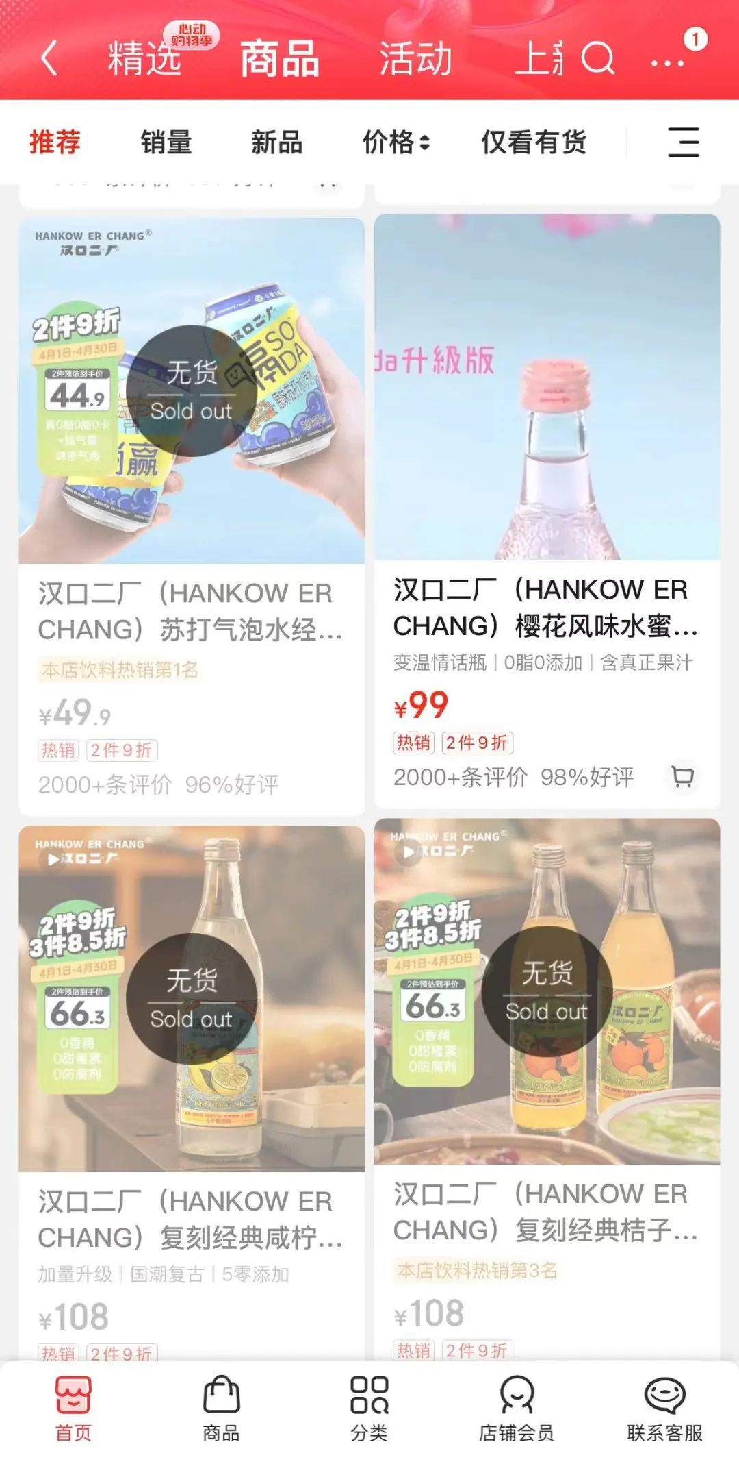 在汉口二厂的京东店铺,也只有几款产品在售,很多经典产品都处于“缺货”状态。