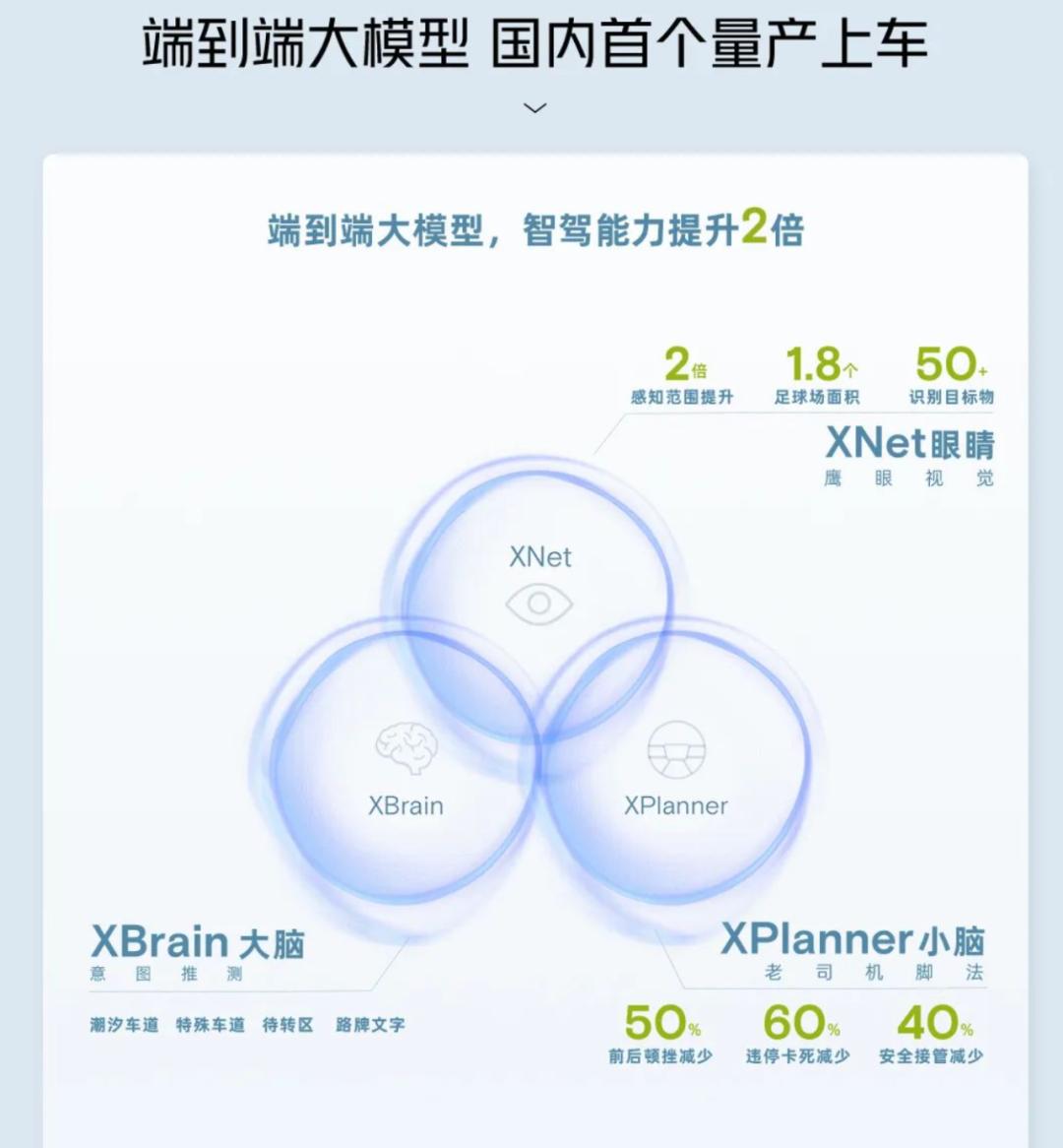其中,XNet是三网合一的深度视觉感知神经网络,对现实世界进行3D高真实度还原,感知范围达到1.8个足球场大小,精准识别50+目标物;XPlanner是神经网络的规划大模型,通过海量数据时刻训练,完成驾驶策略的拟人进化,大幅降低前后顿挫、违停卡死等状况发生;XBrain是大语言模型,针对陌生场景的处理、推理能力大幅提升,在不同道路交通指示、路况下的驾驶决策更加全面。