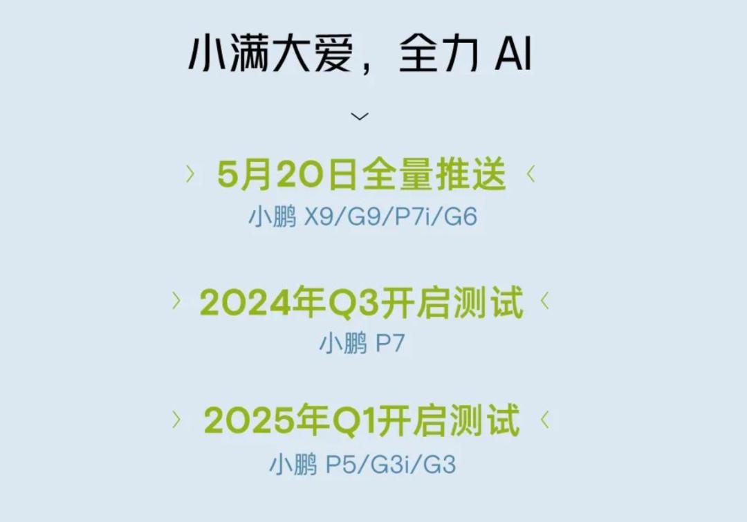 5月20日,小鹏汽车在AI DAY发布会上分享自家AI技术最新进展,宣称将完成迄今为止,更新规模最大的一次OTA推送。这次推送陆续由X9/G9/P7i/G6车型开始,三季度在P7公测,明年一季度在P5/G3i/G3公测,覆盖所有在售车型。