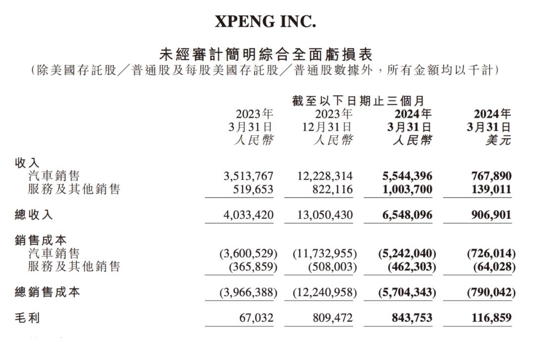 小鹏汽车2024一季度收入构成,图源2024年一季度财报