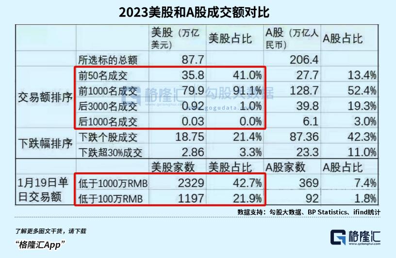 另一个是美股的,整个2023年,美股的前50名的成交额,占总体成交额的比例是41%,前1000只股票的交易额的占比高达91%,后3000只股票,交易额占比只有1%,后1000家的占比基本忽略不计。以2024年1月19日为例,单日成交额低于1000万人民币的美股公司,占比42.7%,低于100万人民币的占比21.9%。