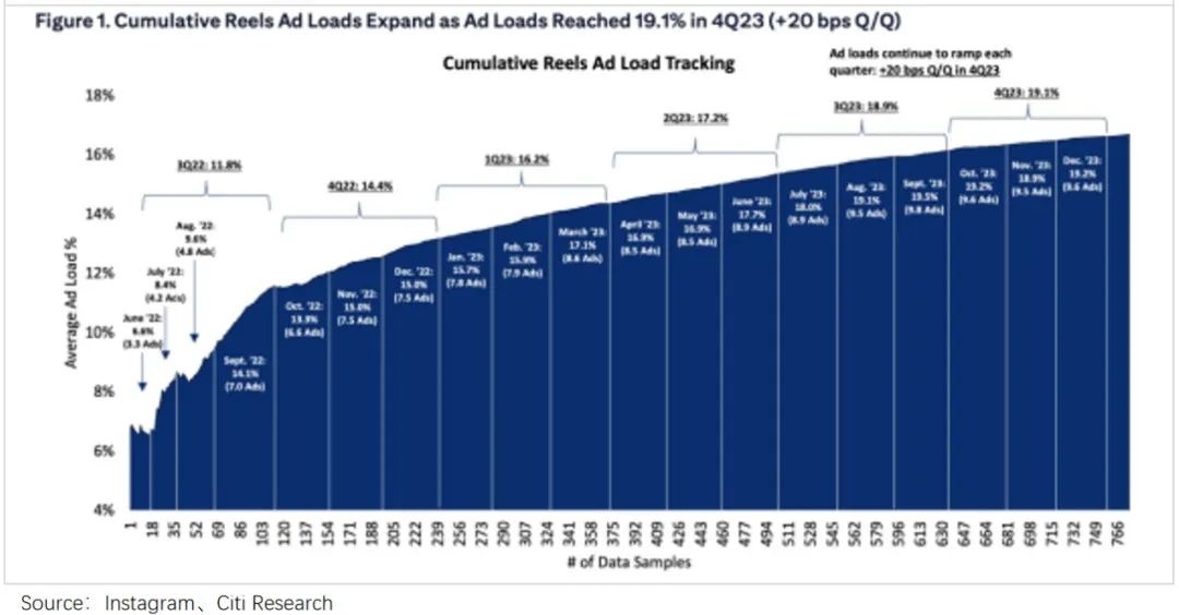如下图,广告加载率一直处于上升状态。花旗集团分析表示,Reels 2024Q1的平均广告加载率已经达20%。