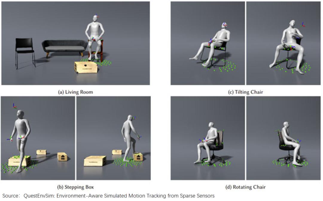 而利用AI算法,不仅能实现“四肢自由”,还能更准确预测全身动作。如当数据显示用户身下是一把椅子时,可以预测其向下的姿势不一定为下蹲,而是坐到椅子上。