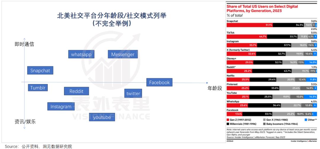 私域有面向Z世代的Snapchat、80后的WhatsApp、中老年人的Nextdoor;公域的Facebook、Ins、twitter、YouTube等,也对应各个年龄段。