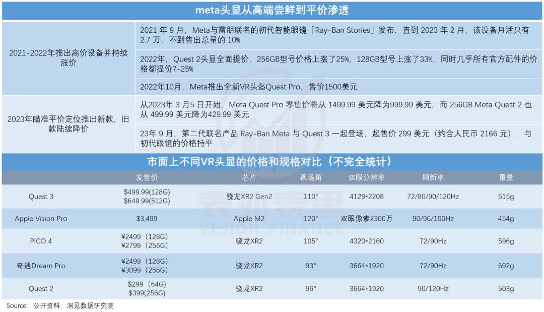可以看到,Meta的头显正从主打高端走向大众化:新推出的Quest3,起售价499美元,行业内同等规格下相当便宜;与此同时,旧款也在陆续降价。