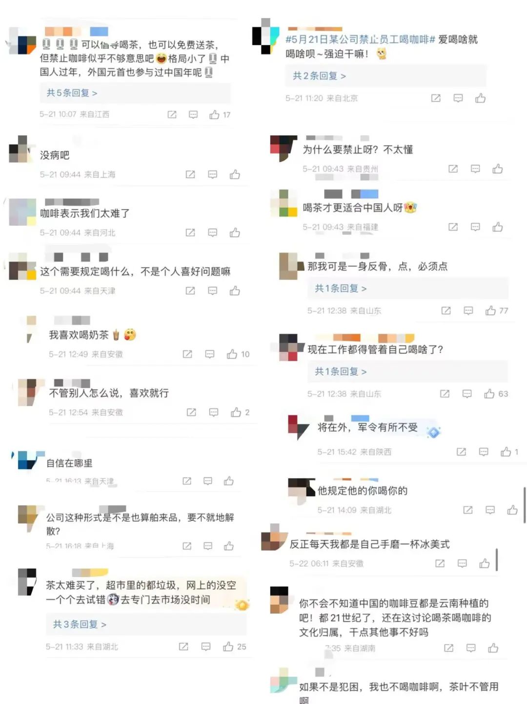 因为词条内容颇具争议性,有网友觉得这样的要求是“干涉员工的生活”,喝咖啡和喝茶,原本就是员工个人的选择,不应该由公司要求。茶和咖啡不是对立面,不应该因为一种文化而排斥另一种文化。