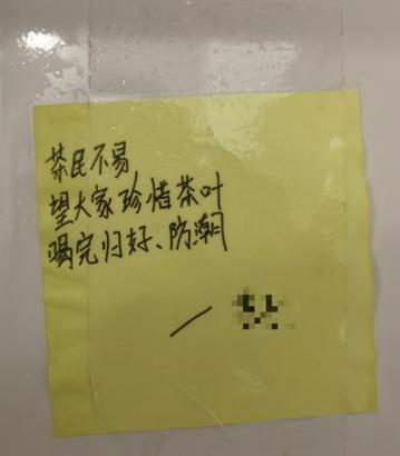 王米泡的茶,则来自公司茶水间。有的是同事出差带回来的,有的是北京鼓楼的联名茶,茶叶和茶包都有,工作日每天都能换不同口味。她发现,办公室喝茶的同事也变多了,还有同事在茶水间摆放茶叶的角落细心贴上纸条,写着:“茶民不易,望大家珍惜茶叶,喝完归好、防潮。”