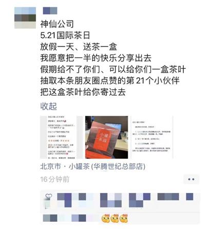 甚至还有员工玩起了花活儿,把假期留给自己,把茶叶送给朋友圈的好友。