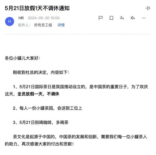 根据通知截图中的“小罐儿”、“杜总”等信息,刺猬公社辗转了解到,该企业是茶企小罐茶。5月21日是国际茶日,根据某权威媒体官方微博发布的视频,在5月21日一场东方茶创新论坛中,小罐茶CEO杜国楹表示:“我们公司已经在521全体放假,我呼吁这个节日从我们茶企做起,逐步推动成为一个国民假日。纪念传统文化最好的方式,就是给它一个真正的节日。”