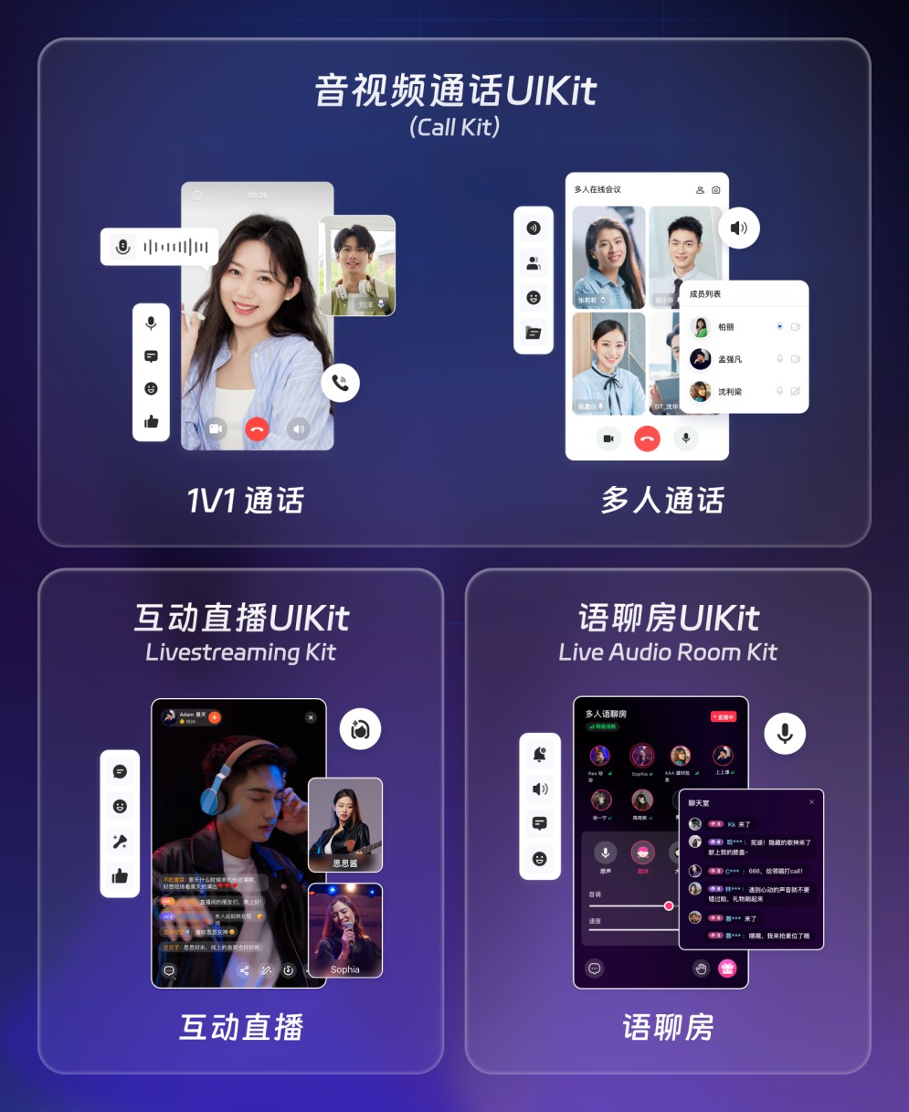 • 自由组合,更灵活 : 含50+UI自定义组件,且支持组合多个 UIKit 搭建通话+直播等互动场景,还可拓展AI美颜等高级功能,提供极大的自由度和创新空间。