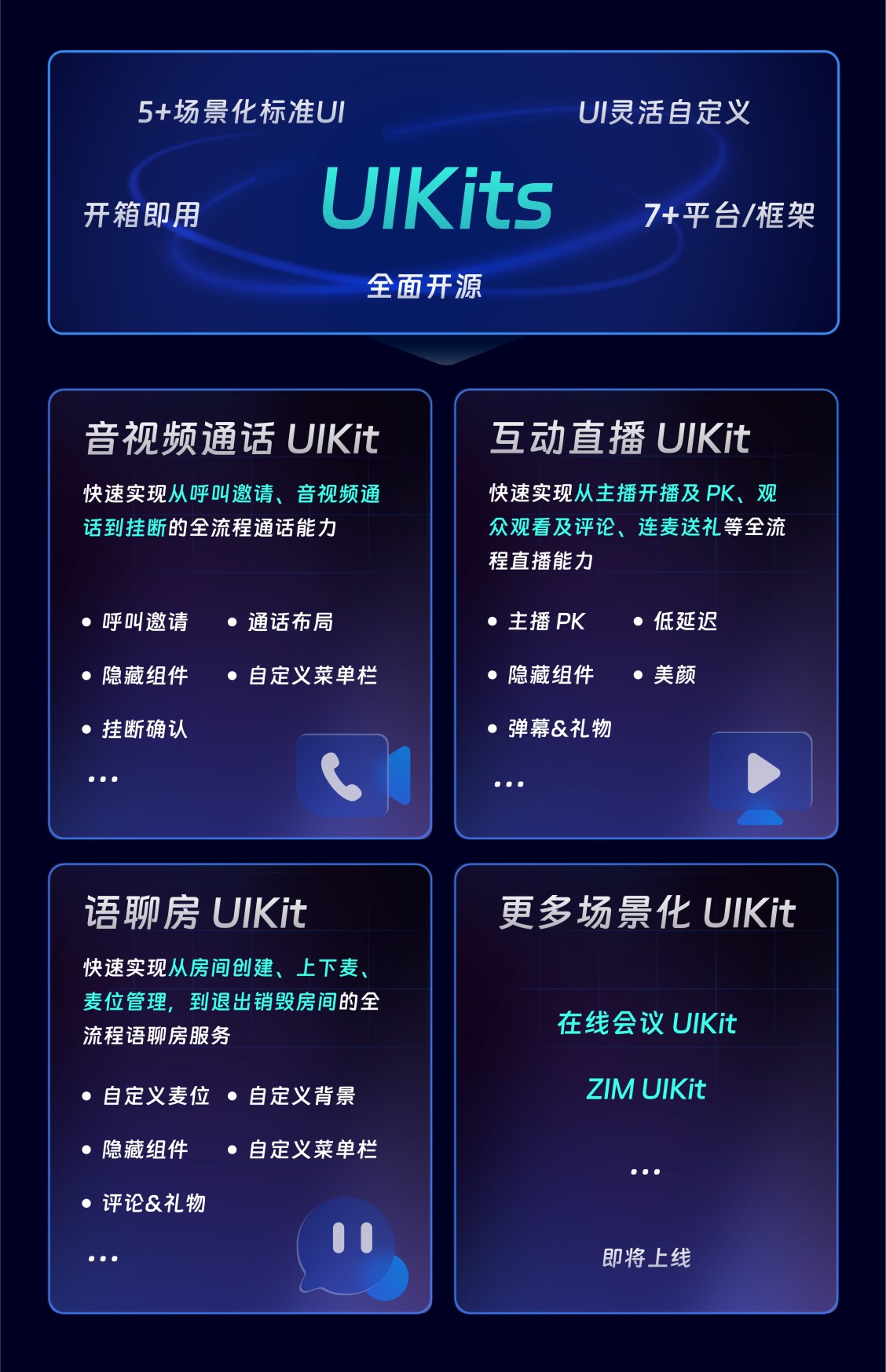 与传统RTC、直播产品相比,UIKits具备场景化标准UI、丰富灵活自定义的组件、开箱即用、全面开源等多重优势,帮助开发者一周内轻松搭建通话、直播、语聊等互动场景,是实现实时互动应用的首选方案。