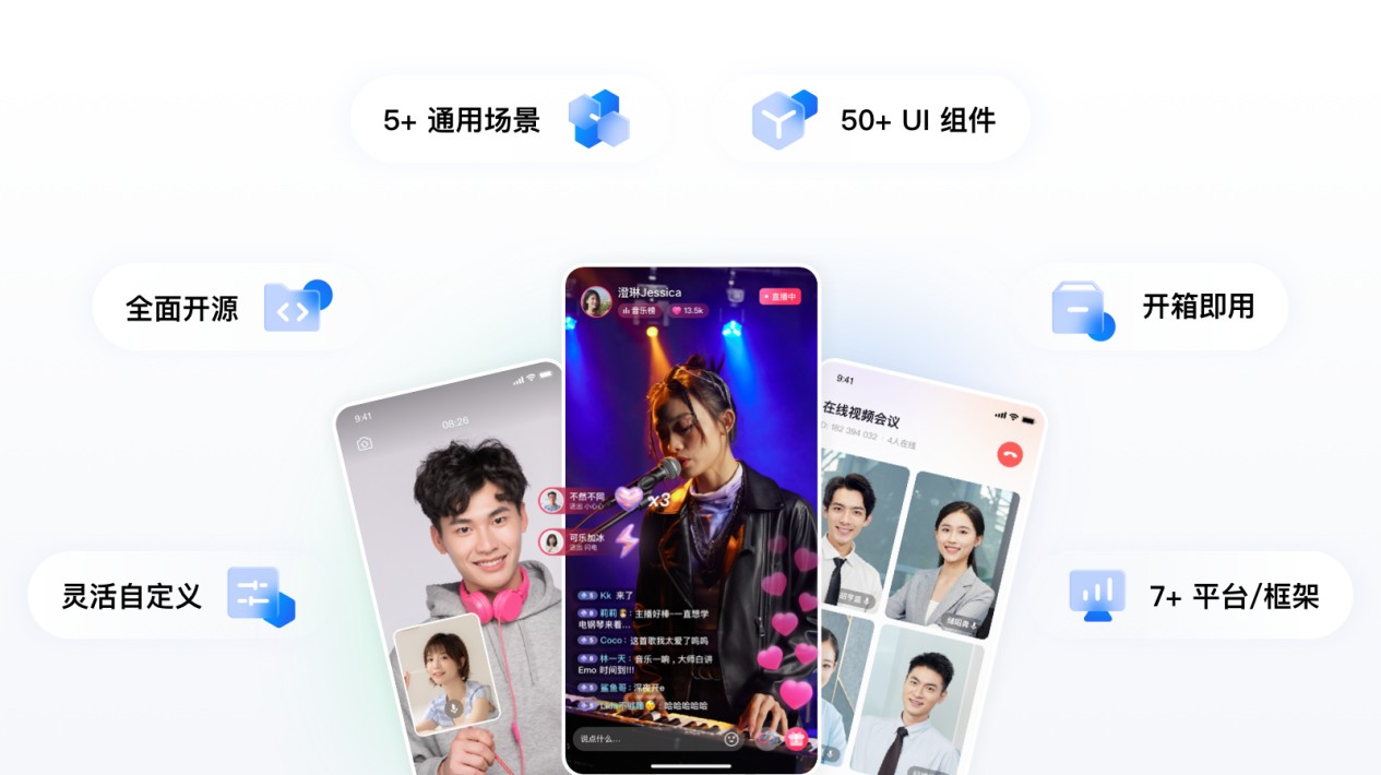• 极速集成,更省时 : 覆盖通话、直播等5+含UI的通用场景SDK,集成了多个互动场景的业务逻辑、UI界面和功能组件,核心技术层全面开源,极大地简化了音视频功能的实现过程。相较于传统互动场景产品方案一个月的开发周期,UIKits一周内即可开发上线。