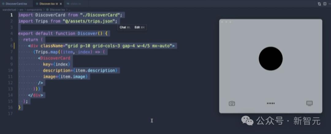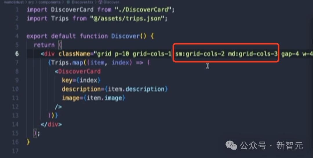 代码是一个名为Discover的React组件,它渲染一个Discover卡片组件网格,每个卡片的数据从trips.json文件中获取。