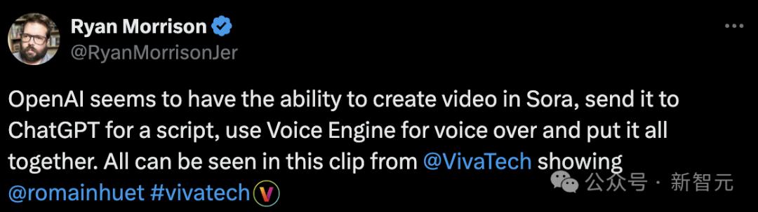 网友称,「OpenAI这个案例向我们展示了,将Sora视频发送给ChatGPT获取脚本,并利用「语音引擎」为其配音,最后将所有模态内容整合到一起」。