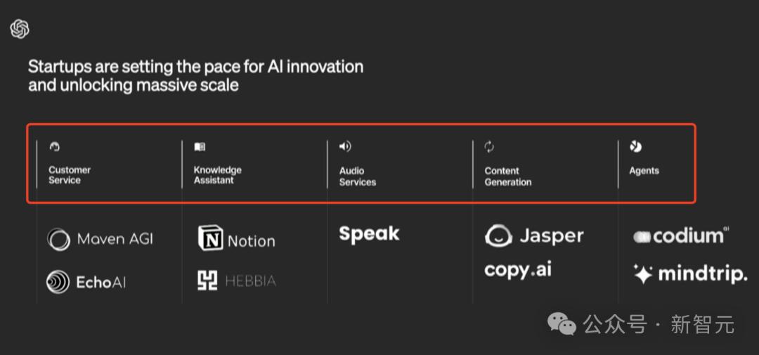 站在OpenAI巨人的肩膀上,众多初创公司已经在客户服务、知识助手、语音服务、内容生成、智能体领域挖掘出的应用,遍地开花。