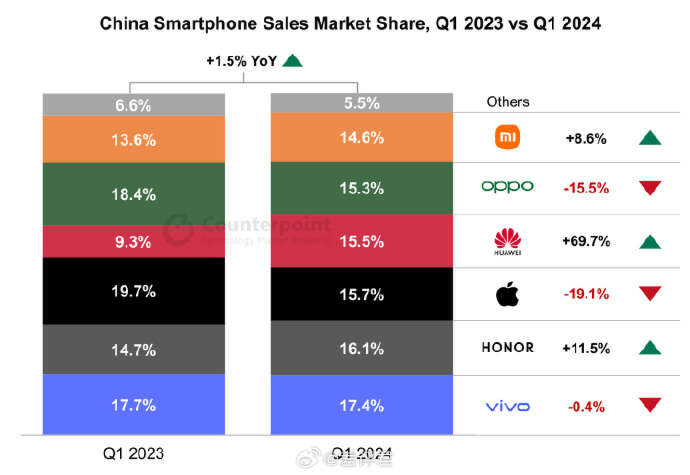 目前,智能机市场面临集体销量下滑的窘境,2024年Q1季度尤其明显,除了华为的市场份额相比2023年有所提升外,苹果、OPPO,vivo等纷纷下滑超10个点。面对激烈的竞争局面,手机厂商纷纷寻找销量的突围之路,以提升产品竞争力并吸引消费者的关注。