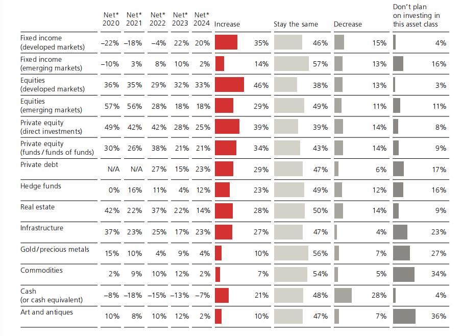 平均而言,只有略多于四分之一(27%) 的家办打算在2024年改变其战略资产配置,低于去年报告中的三分之一(37%)。