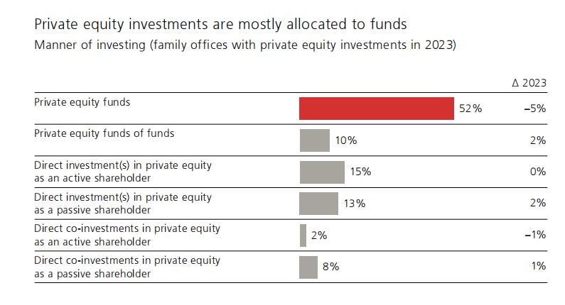 最常见的是,家办私募股权投资于基金和FOF(62%),这提供了多元化和获取GP专业知识的好处。此外,许多家办还进行直接股权投资,其中直接投资的分配比例为38%:15%⽤于作为积极股东的投资,13%⽤于作为被动股东的投资,10%⽤于与GP一起进行共同投资。直接投资在大型家办中越来越受欢迎。在资产超过10亿美元的家办中,几乎一半(49%)将私募股权配置于直接投资。