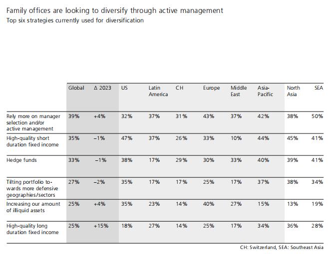 正如平衡投资组合重新受到青睐一样,主动管理也是如此。在技术快速变革、利率预期变化和增长不平衡的情况下,回报分散性的加大为主动管理提供了机会。全球近四分之一(39%)的家办表示,他们目前更多地依赖经理选择和/或主动管理来增强投资组合多元化,较2023年增加4%。