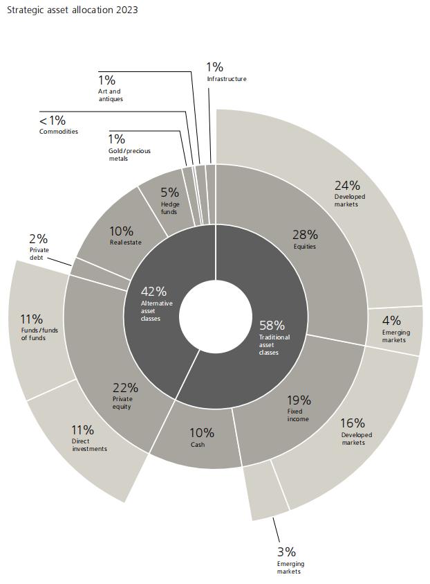 42%配置于另类资产类别:其中私募股权22%、私人债务2%、房地产10%、对冲基金5%、艺术品及古玩等1%。在私募股权领域,家办直接投资占比11%,家办作为LP投资于基金或FOF占比11%。