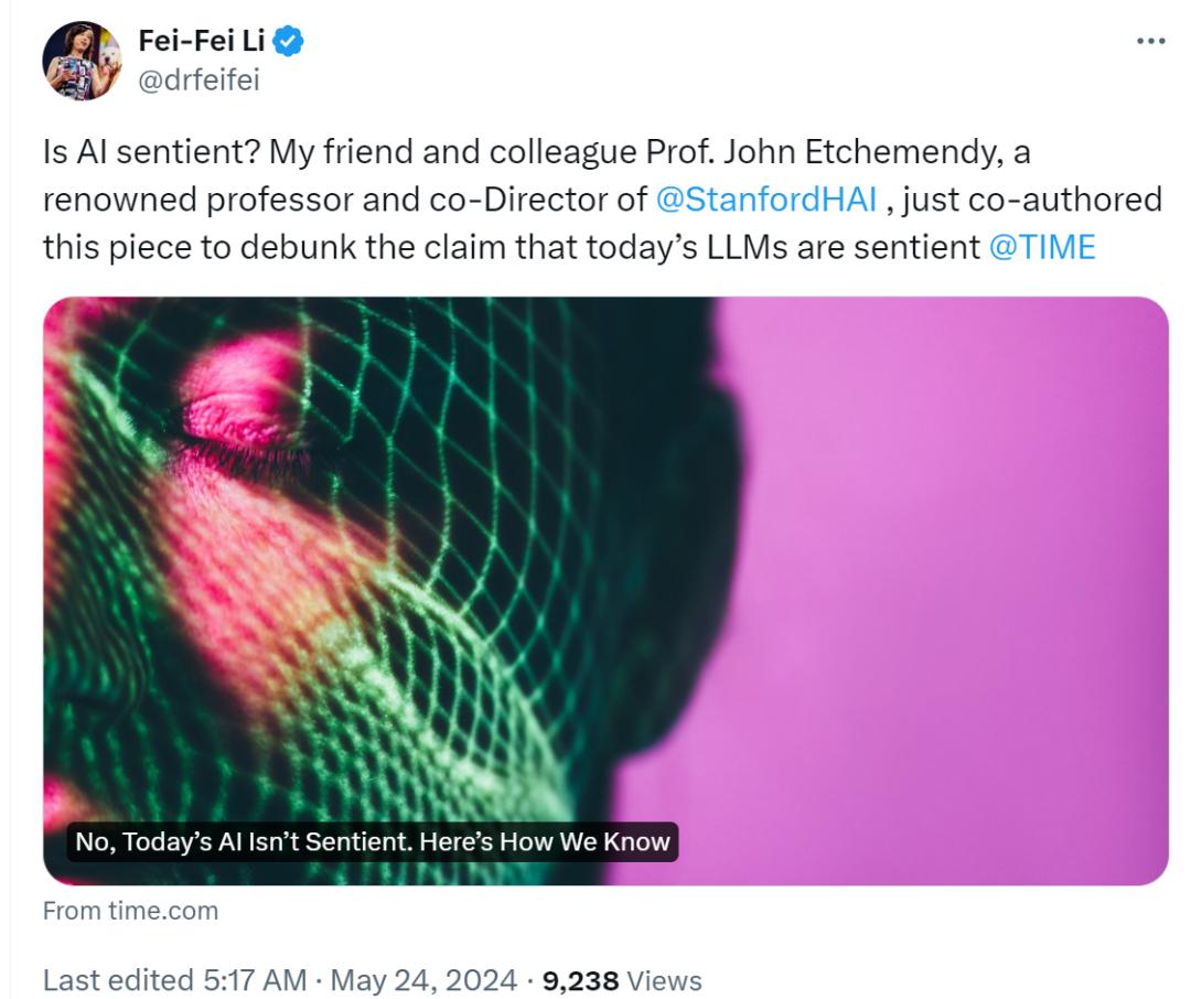 近日,李飞飞连同斯坦福大学以人为本人工智能研究所 HAI 联合主任 John Etchemendy 教授联合撰写了一篇文章,文章对 AI 到底有没有感觉能力(sentient)进行了深入探讨。