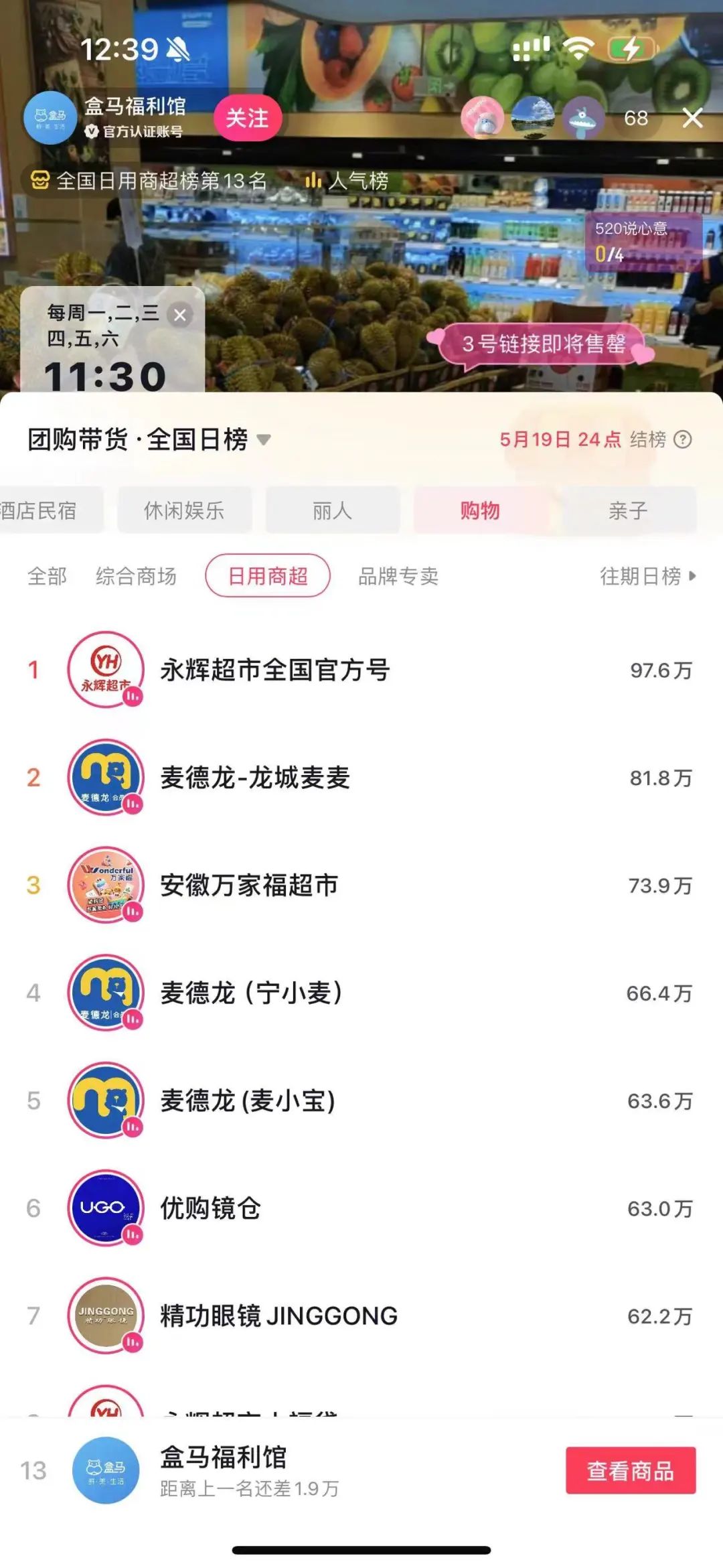 事实上,当前在抖音,诸多商超企业都开设了超市类账号,进行直播带货。并且抖音平台还推出了相应的榜单,量化各超市类账号的热度和业绩。可以确定,未来线上将成为传统商引流的重要一环。
