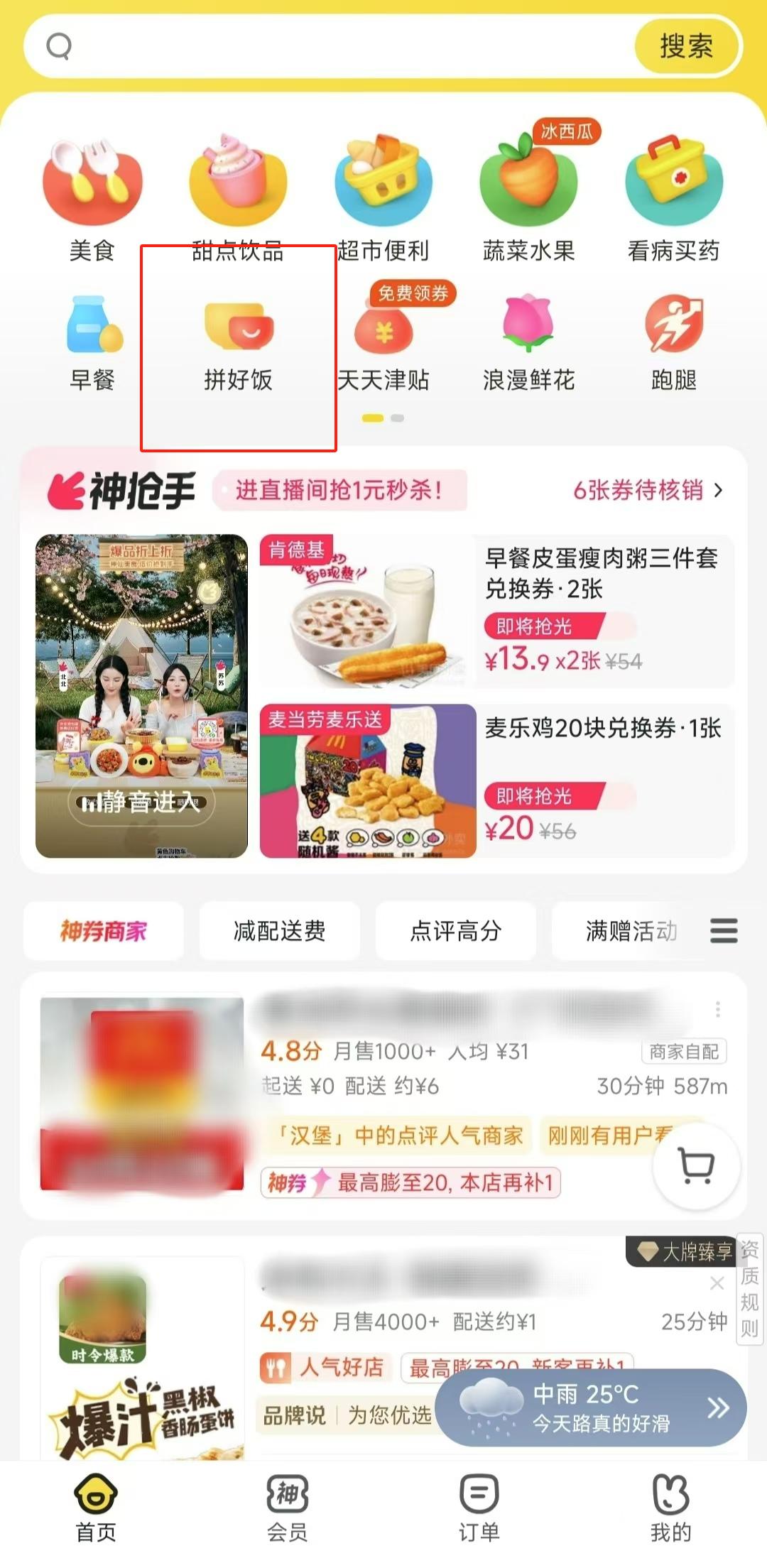 拼好饭一直内嵌在美团外卖App和小程序中,入口在首页的主菜单一级界面。