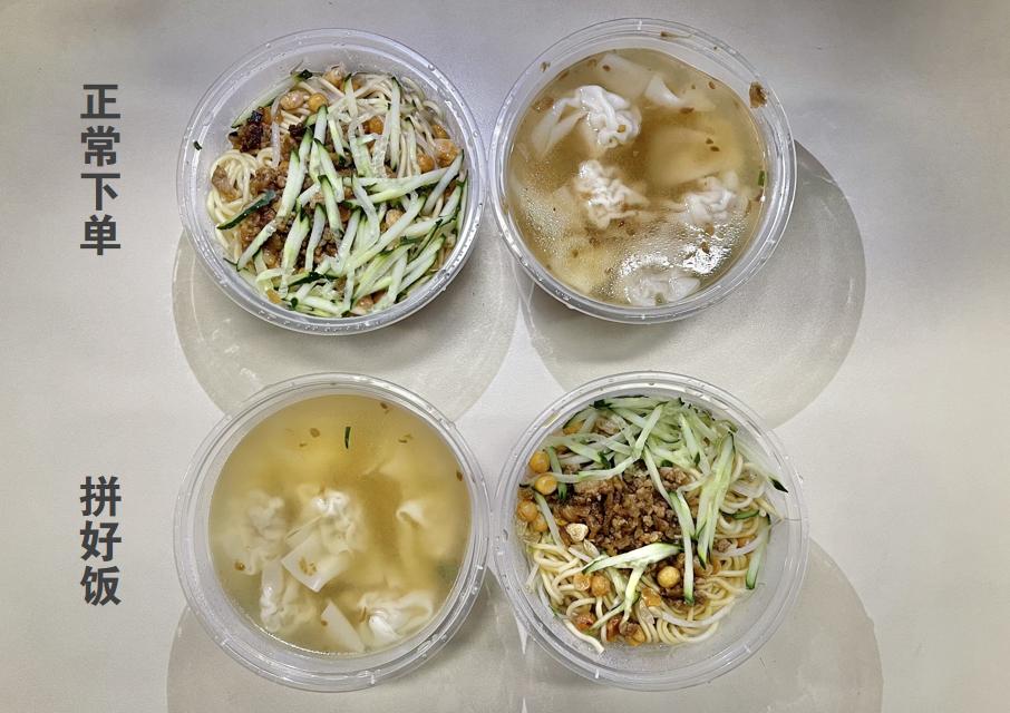 而同一份小馄饨+炸酱面,正常下单和拼好饭的价格分别为20.9元和14元,其中正常下单的馄饨有13个,拼好饭则只有8个。