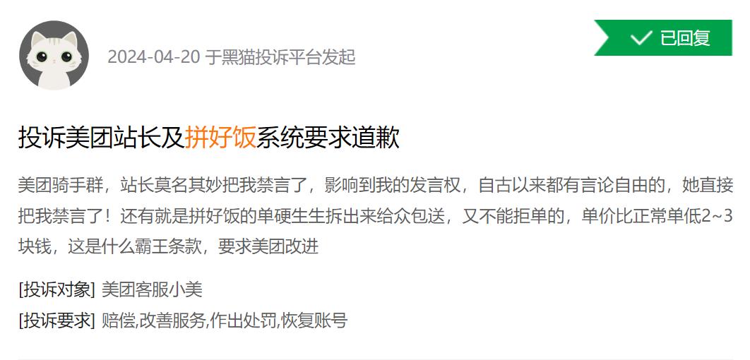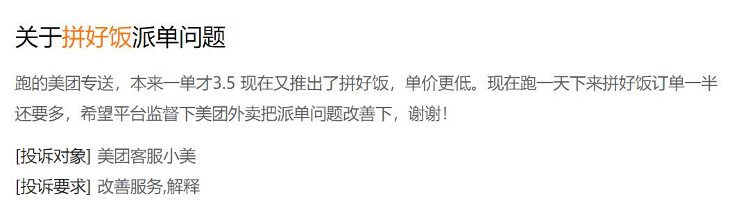 黑猫投诉同样有来自骑手的投诉,有骑手表示,骑手配送拼好饭的单子比正常单价少了2-3块钱,还会强行要求骑手进行配送,其中一直被诟病态度差的众包骑手首当其冲。