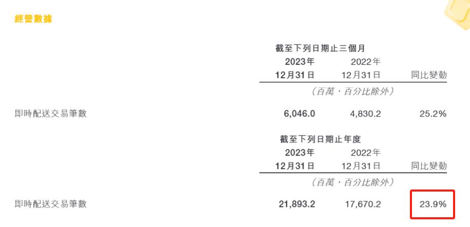 受拼好饭持续扩大覆盖规模带动客群拓展和订单量增长的影响,美团2023年即时配送交易笔数同比上涨24%,而餐饮外卖平均客单价则呈下降趋势。