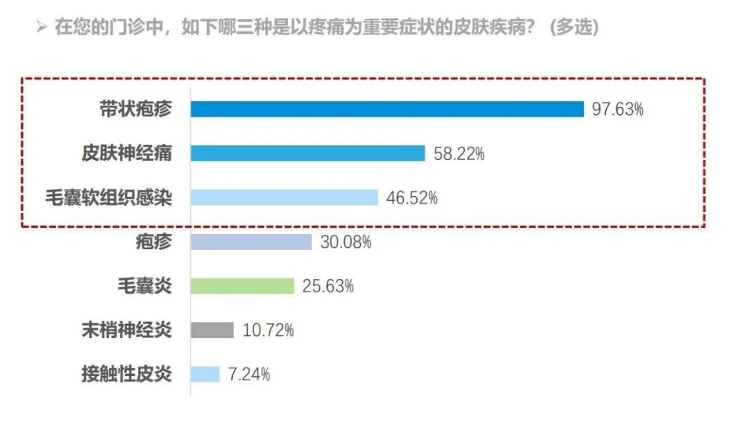 《结果》显示,皮肤科医生日常接诊的皮肤疾病中,疼痛为主要症状的前3名分别为带状疱疹(97.63%)、皮肤神经痛(58.22%)、毛囊软组织感染(46.52%),瘙痒为主要症状的前3名分别为湿疹(78.55%)、特应性皮炎(74.93%)、荨麻疹(74.42%)。