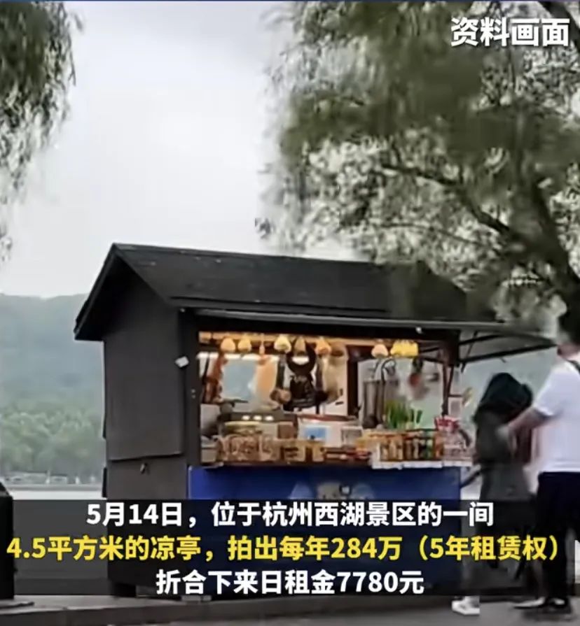 西湖边两处小商亭因天价租金走红,只有4.5㎡商亭,租出284万/年的租金 。