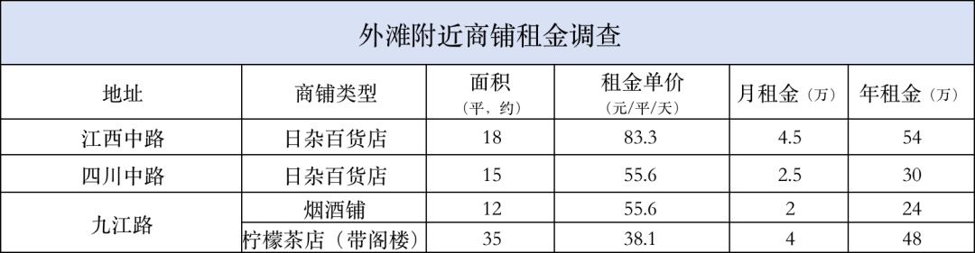 因为有外滩人流量的buff加持,明显比藏在小马路里商铺价格更贵了些 。