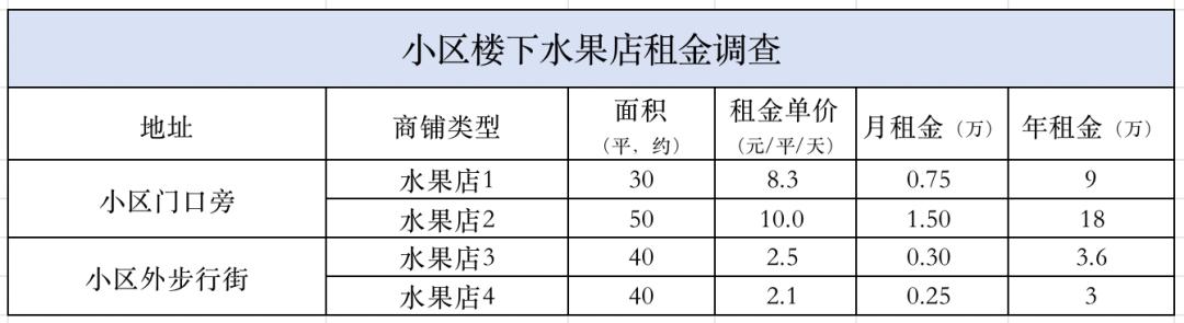 以我调查的这四家为例,水果店1的月租金7500/月,水果店2租金是1.5万/月,面积差不多,租金差距有2倍 。