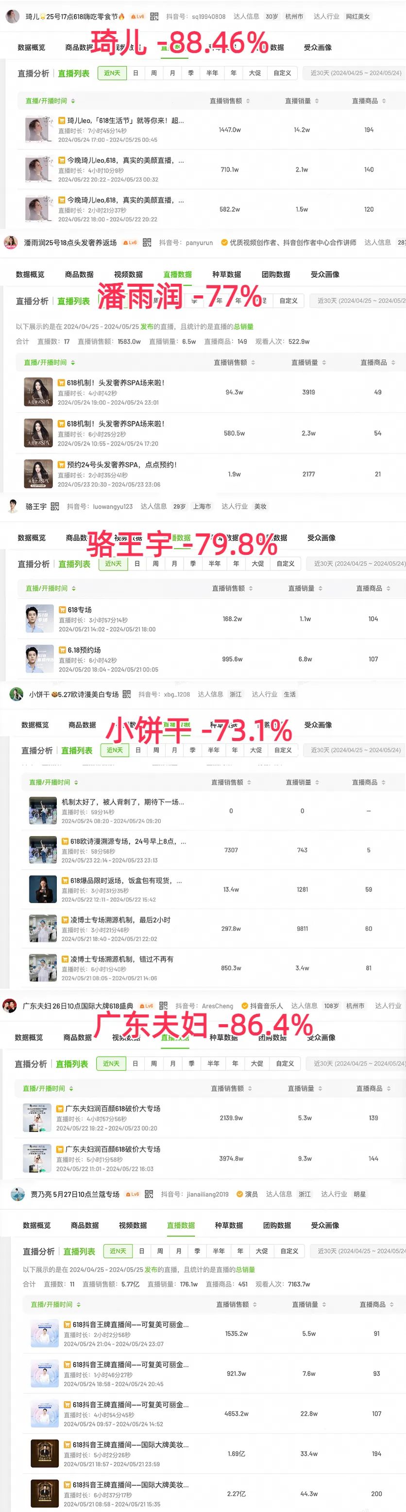 今年抖音商城618于524正式开卖,但很多主播从515就开始抢跑618。至今,大部分涉及美妆的抖音头部主播都完成了首秀。小杨哥淡出,东方甄选(HK:01797)、交个朋友多平台经营,让全行业都风头不盛。