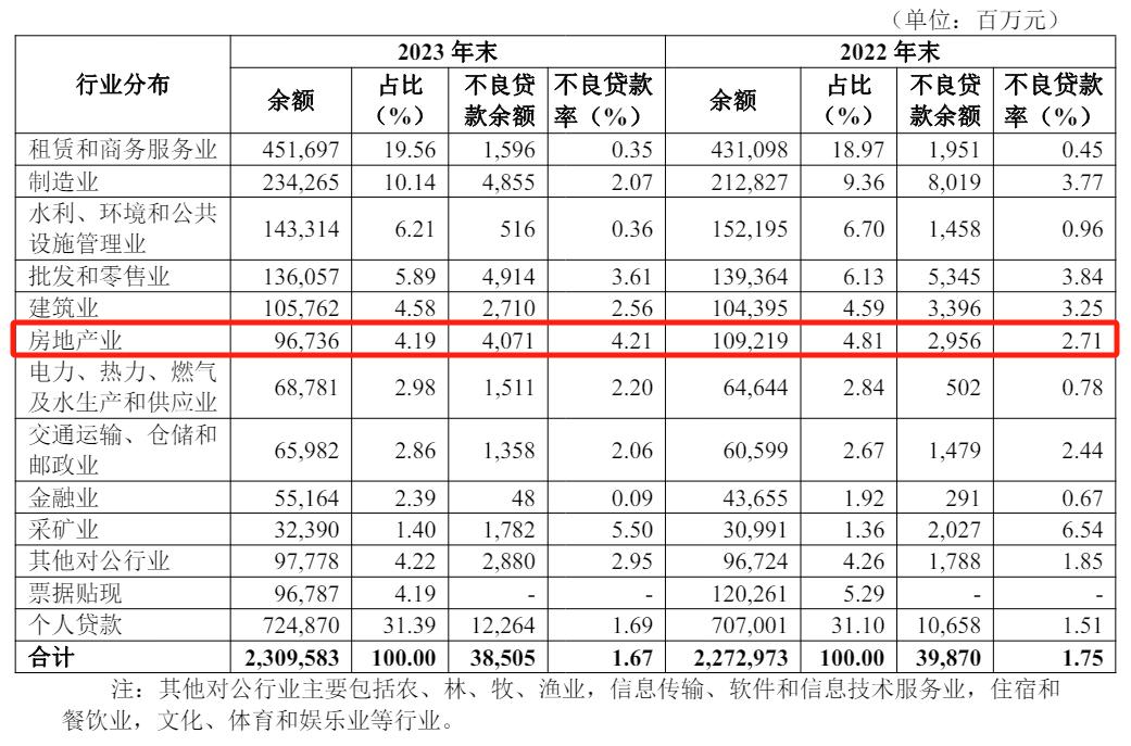 与此同时,不良贷款也主要集中在制造业、批发和零售业和房地产业。尤其值得注意的是对房地产业,虽然贷款余额从2022年末的超1000亿元压降到2023年末的967.36亿元,但是不良贷款从29.56亿元升高到了40.71亿元,不良贷款率从2.71%大幅提升到4.21%。