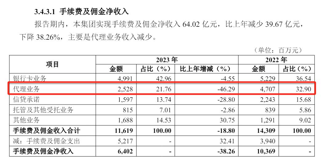 华夏银行分析指出,2023年手续费及佣金净收入的大幅下降,主要是代理业务收入减少拖累。当年代理业务的同比降幅高达46.29%。这一项业务指的是银行接受客户的委托,代替客户进行一系列金融服务活动,例如支付代理、收款代理、证券代理、保险代理等。