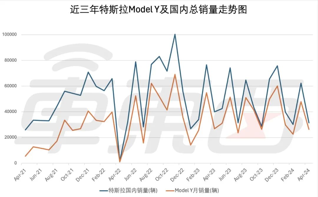 ▲近三年特斯拉Model Y及国内总销量走势图(图:车东西)